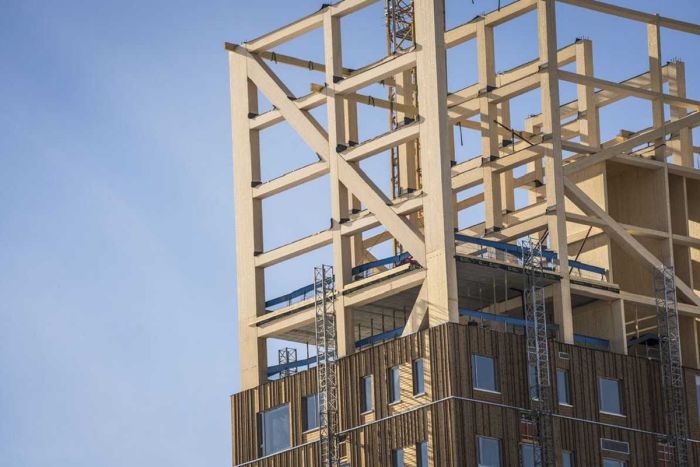 Каркас может включать соединительные элементы, выполненные из другого материала. Здание с перекрытиями из железобетонных пластин или плит, уложенных на деревянные балки, также считаются деревянным, поскольку бетонные компоненты не являются здесь несущими. «Мьёсторнет» состоит из 18 этажей плюс ещё одного подземного этажа.