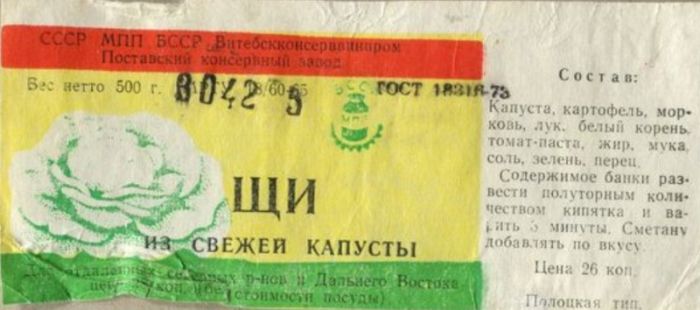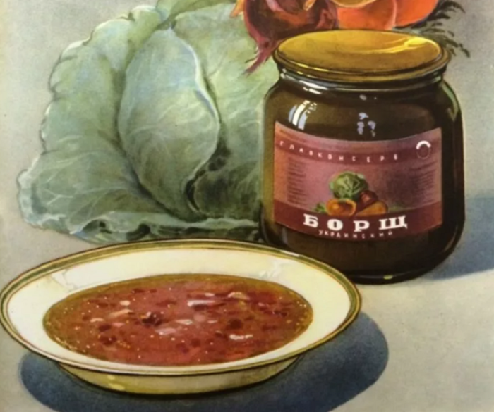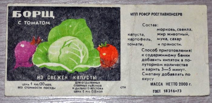 Борщи, щи, свекольники и рассольники в консервах представляли собой не традиционное первое блюдо, каким мы привыкли видеть его в своих тарелках, а всего лишь заправку из кореньев и овощей, которую обжарили в жире, добавили к ней муку, сахар, пряности, томатную пасту и пюре из красного сладкого перца.