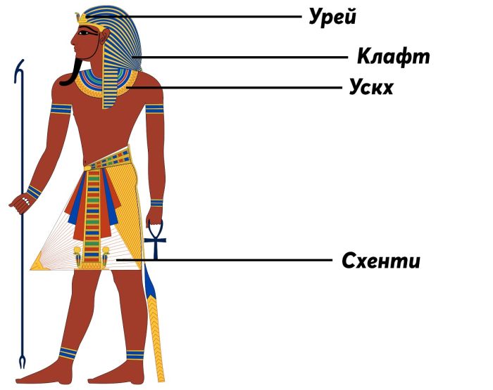 На начальных этапах развития Древнего Египта правители носили схенти – набедренную повязку. Такая же повязка была у других членов общества. Отличительные знаки фараона – платок для головы либо корона. Также правители носили золотые обручи, выполненные в форме змеи. Головной убор назывался «урей» и являлся символом власти точно так же, как скипетр, накладная борода.