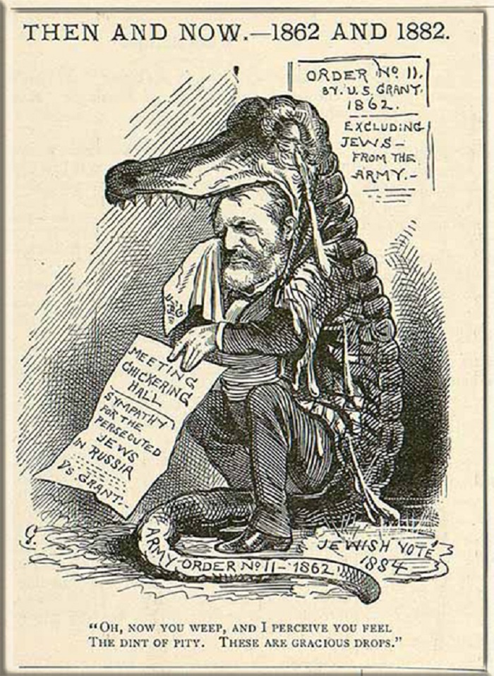 Карикатура Бернхарда Гиллама, изображающая Улисса С. Гранта, обхаживающего еврейских избирателей и льющего «крокодиловы слёзы» из-за преследования евреев в России.