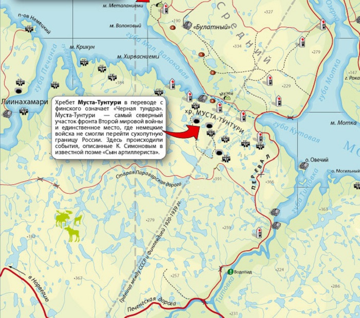 Муста-Тунтури - горный хребет, который пролегает между полуостровом Средний и материком. Если перевести название с финского, получится "черная тундра", но после событий Великой Отечественной у хребта появилось ещё одно название - "Долина смерти". Боевые действия, проходившие здесь с июня 1941 года по 1944 год, являлись самым северным театром сухопутных сражений в ВОВ.