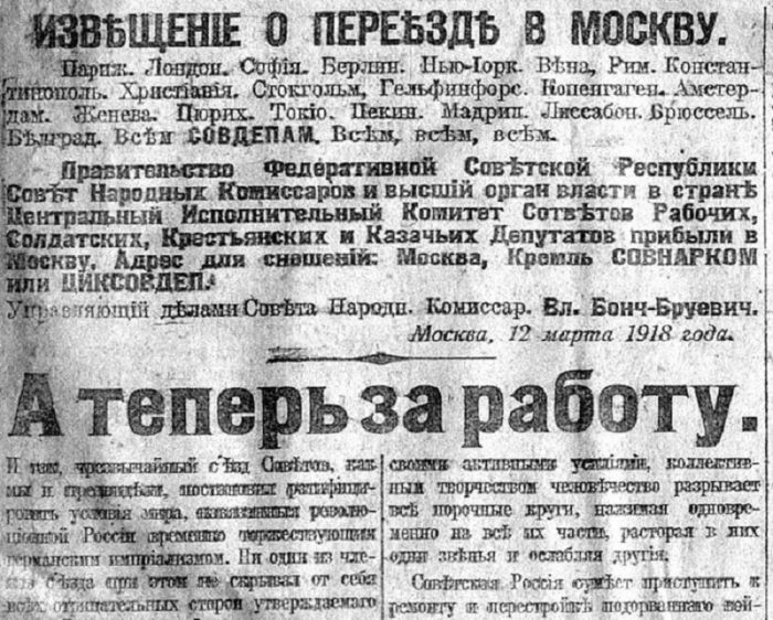 «Петроград представляет собой объект для нападений и наступлений, во втором случае ему грозит также постоянная угроза нападения не только с суши, но и с моря. Поэтому, если нужно вообще сохранять столицы, то, конечно, нужно избавить их от риска быть захваченными врагом», — писала 9 марта 1918 года газета «Знамя труда».