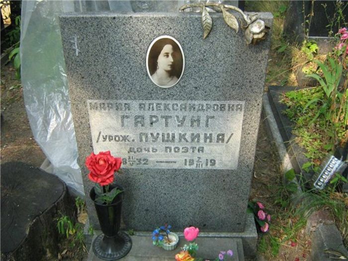 7 марта 1919г. сердце ее остановилось. Так закончила свой жизненный путь Мария Александровна Пушкина – Гартунг (1832-1919), бывшая фрейлина Двора Ее Императорского Величества, дочь Великого Отца, который называл ее «беззубая Пускина». Похоронили ее в Донском монастыре добрые люди.