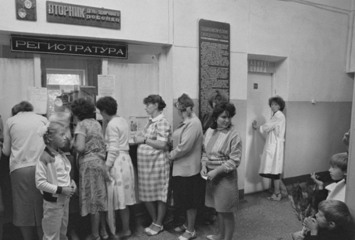 Направляясь в поликлинику, чтобы посетить врача, «хомо советикус» тоже не ждал ничего хорошего. Да, среди докторов были разные люди с разным характером и воспитанием, но речь сейчас не о них. Чтобы стать пациентом, гражданину нужно было пройти «семь кругов ада» в регистратуре. Там с самого открытия медицинского учреждения клубилась толпа, желающая получить заветный талончик к специалисту. Работники регистратуры часто вели себя грубо, не делая скидок даже инвалидам и беременным. Собратья по очереди тоже не церемонились и громко отстаивали свое право прежде других попасть к окошку.