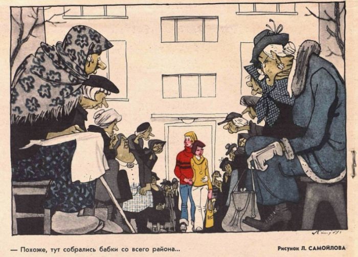 Шутки о бабушках возле подъезда — это бессмертная классика. Старушки на скамейке всегда знали, кто к кому идет, кто когда выпил лишнего и кого поколачивает супруг. Бабушки любили раздавать советы по делу и без, что-то выведывать и распространять сплетни и слухи. Когда их поведению пытались противостоять, пожилые женщины объединяли усилия и не стесняясь осыпали оппонента оскорблениями.