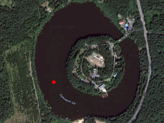 Луковое озеро на Google картах. Красной точкой отмечено место трагедии