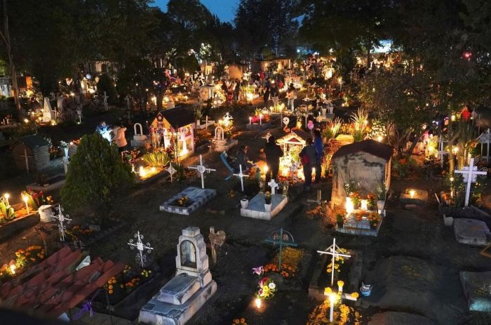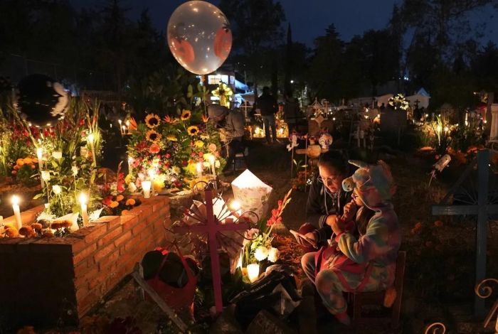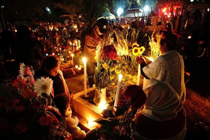 В Оахаке, например, мертвых поминают бдениями, а их жизнь празднуется собраниями на кладбищах, куда приносят еду и напитки, которые кладут на алтари.