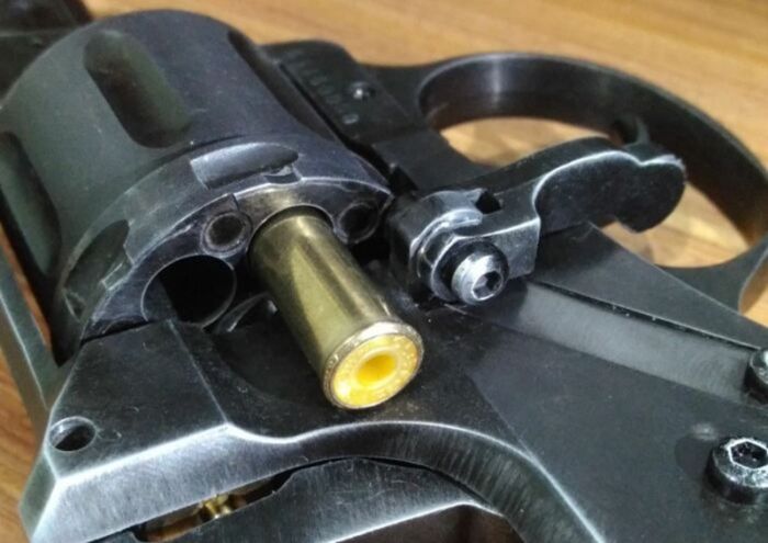 Второй серьезный недостаток заключался в системе перезаряжания. Существует три основные системы заряжания револьверного оружия. Первая – закладывание боеприпасов под заглушку. Вторая – закладывание боеприпасов в откинутый магазин. Третья – закладывание боеприпасов в открытый магазин в результате «переламывания» конструкции оружия.