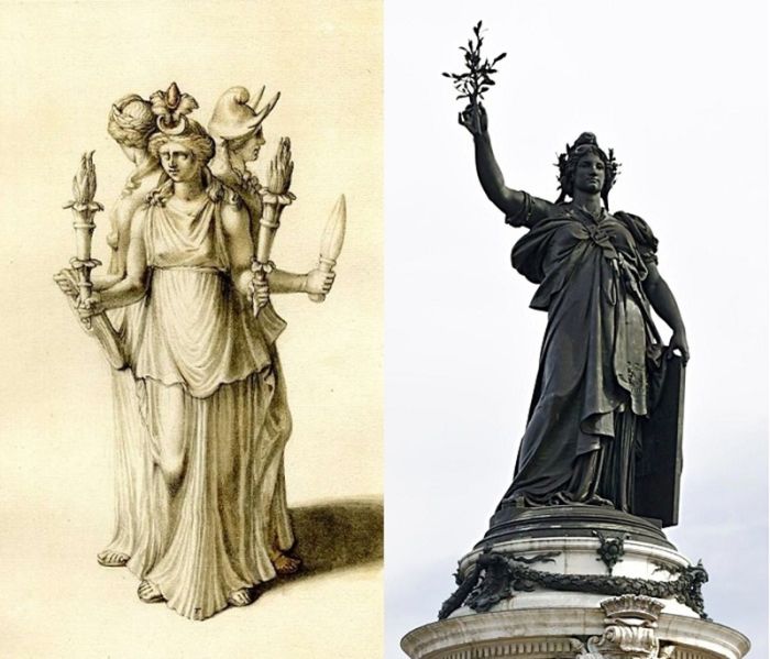 Изображение одной из статуй Гекаты. На одной из голов Гекаты такой же колпак, как и на статуе, изображающей освобождённую Францию.