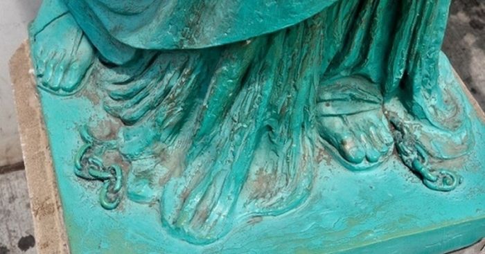 Легко догадаться, что цепи под ногами Свободы – её собственные разбитые оковы. Если приглядеться, статуя словно делает шаг вперёд, то есть буквально переступает через свои цепи, оставляя их в прошлом.