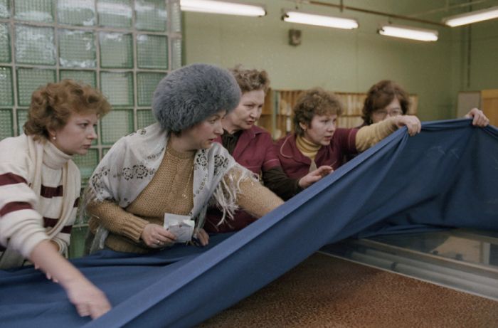 Москва. 1 января 1987 г. Члены претензионной группы Московского производственного швейного объединения «Москва» во время проверки качества ткани Ростокинской камвольно-отделочной фабрики.