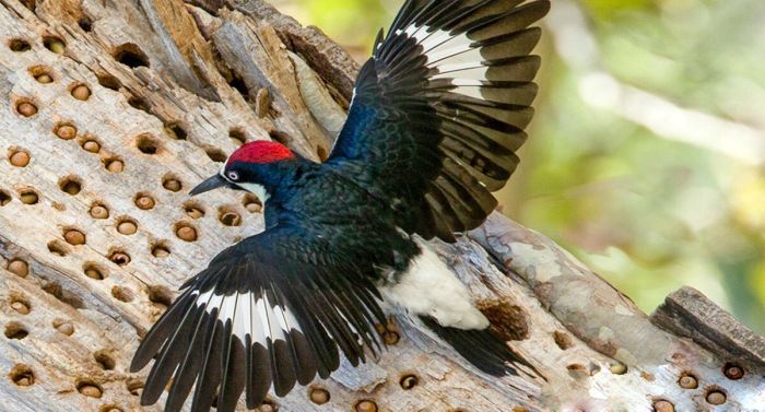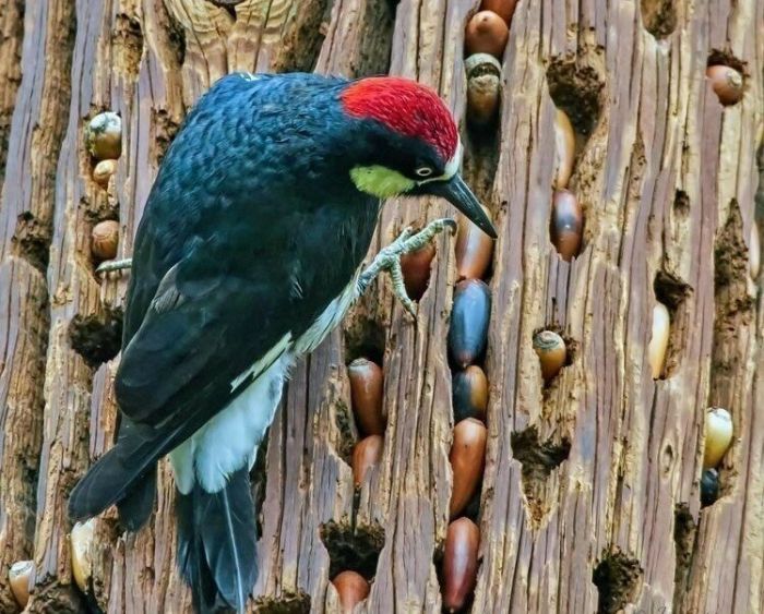 Только на одном таком стволе можно насчитать 60 тыс желудей! Но и это ещё не всё! Когда жёлуди усохнут в своих отверстиях, птицы перекладывают их в другие — поменьше. Да, все 60 тысяч! Так что, когда ты отказываешься помогать мамке закручивать 30 банок солений, вспомни какие запасы делают эти ребята. И вздрогни.
