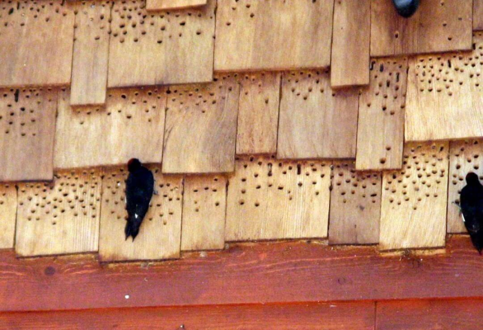 Дятел будет запасать жёлуди до тех пор, пока не заполнит всю поверхность ствола. А потом станет вдалбливать жёлуди в новое дерево. Если деревьев поблизости нет — не беда. Под амбар обустраиваются крыши и отверстия домов, электрические столбы, заборы...