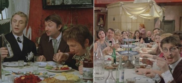 Знаменитые советские фильмы актуальны и любимы до сих пор, и особенный колорит им придают сцены с застольями, которые всегда выглядят комедийно и жизненно. Но как легендарным актерам и режиссерам удавалось добиться такой реалистичности? Возможно, потому, что еда на столах – не бутафорская, а настоящая, а в бокалах вовсе не чай и не лимонад, а кое-что покрепче. Ну а «заливная рыба» – реальная гадость. Раскрываем секреты гастрономии легендарных кинокартин и связанных с ними курьёзов.