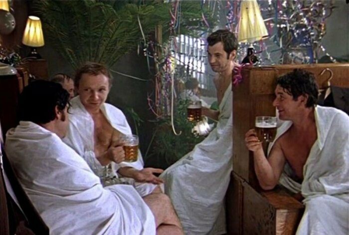 В фильме «С лёгким паром» во время сцены в бане в кадре тоже были реальные пиво и водка, а соответствующая кондиция актеров – не наигранная, а настоящая. Правда, это не была задумка режиссера Рязанова. Все дело в том, что сцену снимали не в реальной бане, а в холодном павильоне. Актерам привезли настоящее пиво, но им этого показалось мало – слишком уж они продрогли. Мягков, Ширвиндт, Бурков и Белявский тихонько заменили бутафорскую водку на принесенную из дома, тем более что у Александра Белявского был день рождения – грех не отметить.