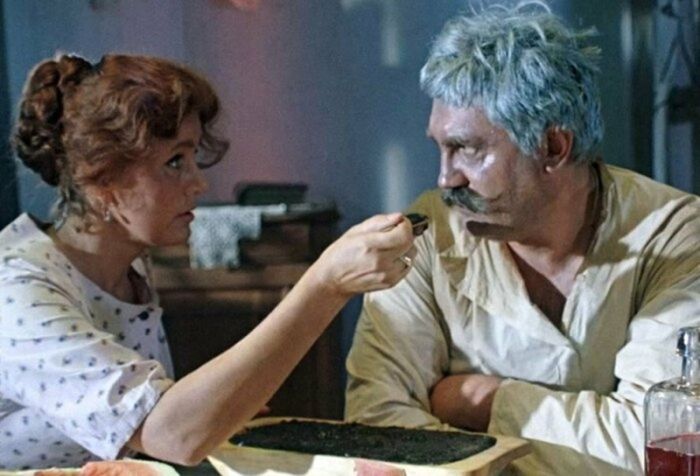 В комедии «Женитьба Бальзаминова» изюминкой стала сцена с богатой вдовой, которую уморительно смешно сыграла Нонна Мордюкова. В кадре купчиха сидит на природе за столом с самоваром, пьет чай и угощает пирожками сваху, выспрашивая её, нашла ли та ей жениха.
