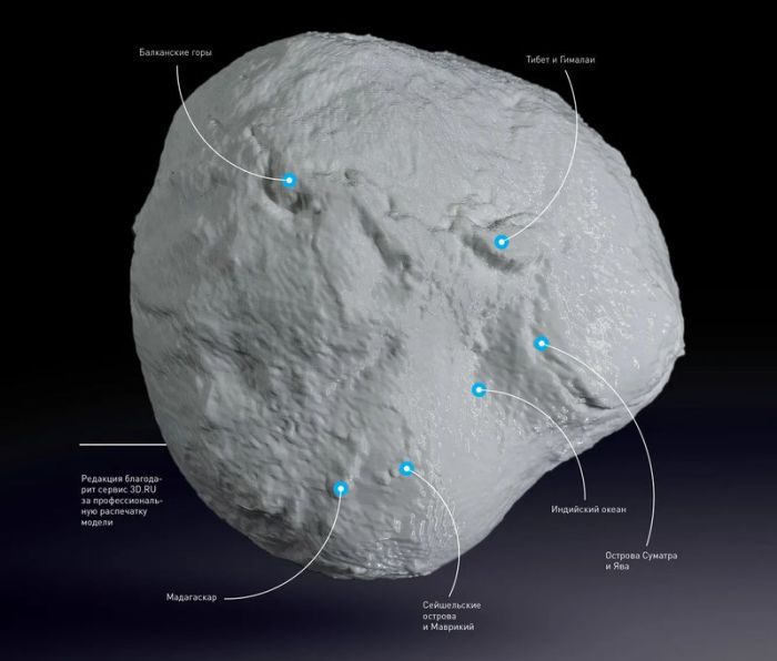 На фоне размеров всей планеты даже самые крупные детали ее поверхности покажутся совсем крошечными. Например, для Бездны Челленджера (10,9 км ниже уровня моря) отклонение от среднего радиуса Земли составляет всего 0,17%, а для Джомолунгмы (8,8 км) – 0,14%. Тем более незаметны будут аномалии формы геоида: от эллипса его поверхность отклоняется в пределах от –85 до 106 м. Поэтому 3D-модель, подготовленная учеными американского Национального управления океанических и атмосферных исследований (NOAA), усилена: аномалии на ней дополнительно выделены.