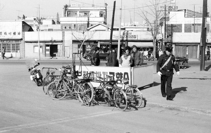 Выше вы можете видеть фотографии, сделанные в 1976 году в провинции Кёнгидо в Южной Корее. Несколько мужчин и женщин с понурыми головами стоят в тесной импровизированной "клетке" из невысоких ограждений. Рядом была полиция, несколько велосипедов и мопед.