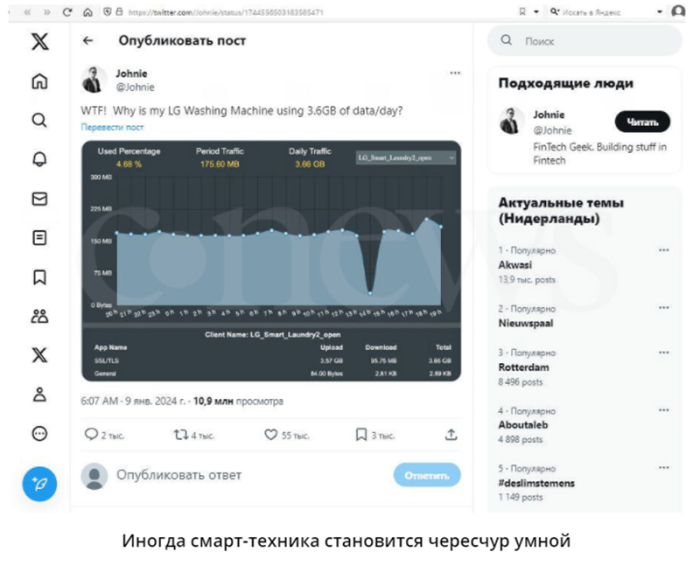 Владелец умной стиральной машины LG с возможностью подключения к интернету обнаружил, что это чудо современной бытовой техники ежедневно выгружает в Сеть почти 4 ГБ трафика. Чем именно машина делится с миром, так и осталось загадкой – производитель проигнорировал все запросы, а выяснить это самостоятельно ему не удалось. Решить проблему помог цифровой «железный занавес» – машина была принудительно переведена в режим офлайн.