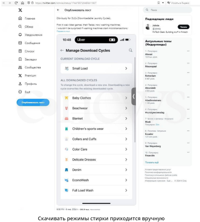 В процессе поиска истины Johnie обнаружил два факта, один любопытнее другого. Первый заключается в том, что его стиральная машина по умолчанию не поддерживает целый ряд привычных многим режимов стирки – их приходится скачивать дополнительно.