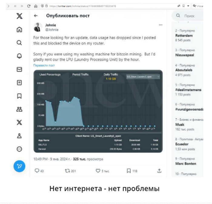Johnie направил несколько запросов в техподдержку LG в попытке выяснить природу трафика, генерируемого стиральной машиной, однако ответа так и не получил. В комментариях к его публикации в Х пользователи стали озвучивать свои предположения, и наиболее часто встречающееся среди них – это если кто-то использует стиральную машину для майнинга биткоина.