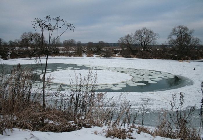 Диаметр ледяных кругов тоже бывает немалым. И они тоже вращаются. А образуются, как правило, на реках. Не исключено, что и ледяные круги это следы «летающих тарелок» - ведь механизм их появления ученые пока не прояснили. Есть лишь гипотезы, что зимой острова формируют кольцеобразные течения - водовороты, которые закручивает течение.