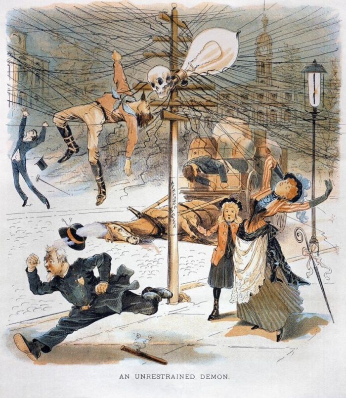 Именно столбы почему-то больше всего тревожили умы простых горожан. В 1889 году серия крупных электроаварий ужаснула Нью-Йорк, запаниковавшие ньюйоркцы даже начали громить инфраструктуру. Газеты, вроде Tribune, подстегивали истерию: