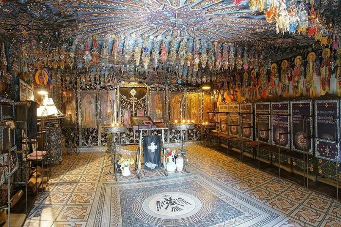 Панно и большие композиции из бисера выполнили сами монахи и украсили ими стены храма. Такой необычный способ декорирования был выбран потому, что из-за высокой влажности традиционные росписи на стенах не держались. Помимо стен, бисером дополнили византийский крест и лампады.