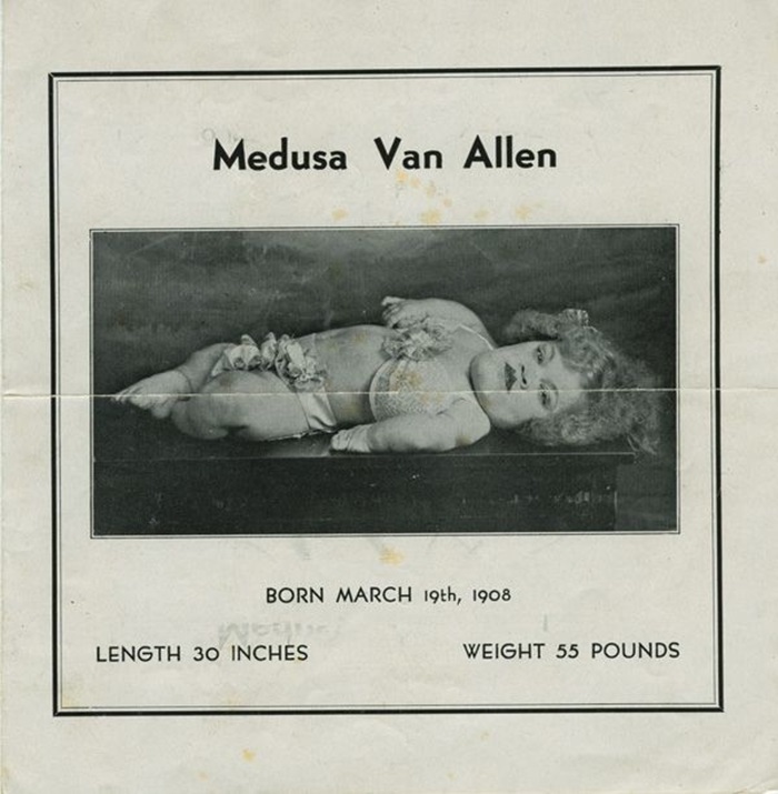 Медуза Ван Аллен родилась в Огайо 19 марта 1908 года. Примерно в 6 месяцев рост тела ребёнка навсегда остановился. Продолжала увеличиваться только голова. Из-за проблемы девочка не могла ни сидеть, ни стоять, только лежать. Врачи разводили руками и ничего не могли сделать с её странным состоянием.