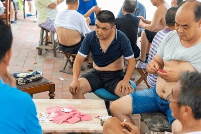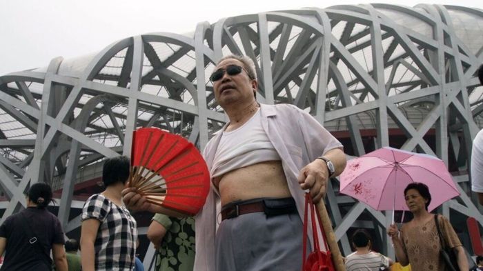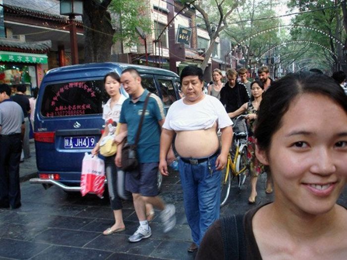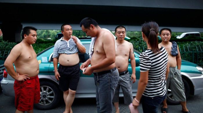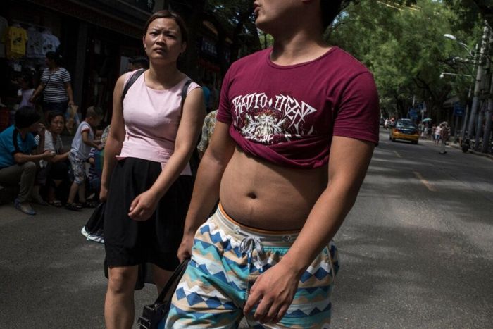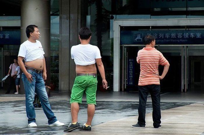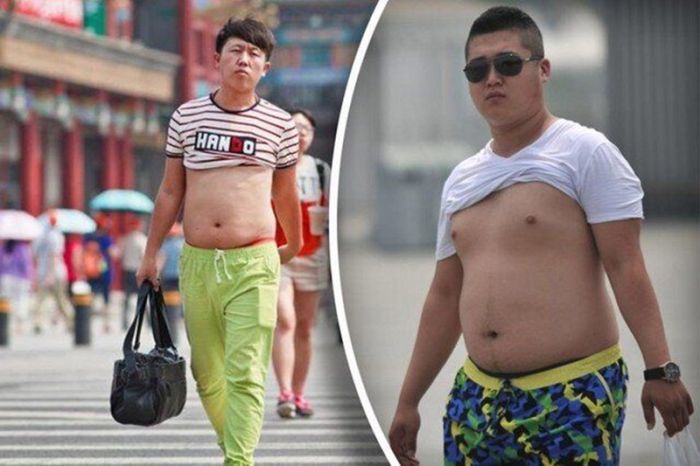 Кто окажется в китайском городе в разгар жары, обязательно столкнется с одним из таких мужчин - по большей части немолодых, в задранной до груди футболке, позволяющей выставить напоказ толстый живот. Этот "освежающий" прием стал настолько распространенным, что даже получил официальное название - "пекинское бикини".