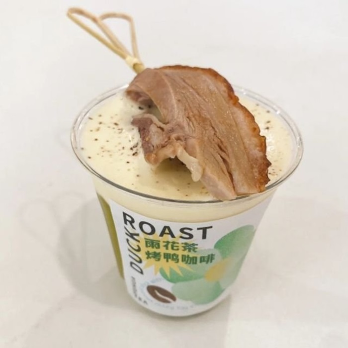 Смешиваются кофе и чай с молочной-сырной пеной, посыпается солью с перцем, а сверху кладется "закусочный" кусочек жареной утки.