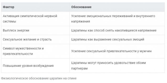 Феномен царапин на спине во время страстного акта у мужчин и женщин имеет свое физиологическое обоснование. Он связан с биологическими особенностями организма и эмоциональными реакциями во время сексуального возбуждения.