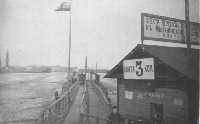 Зимой 1894 года на льду Невы появились первые пассажирские вагоны. Они ходили по четырём маршрутам. Сначала это было своеобразным аттракционом: вагоны под действием силы тяжести двигались по наклонно уложенным рельсам с Васильевского острова на Сенатскую площадь и обратно. Но уже через год на смену миниатюрным открытым вагонам пришёл настоящий трамвай на электрической тяге, который горожане сразу назвали «ледовый трамвай».