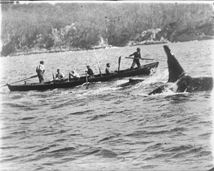 В 19 веке до Австралии добрались европейские колонизаторы. Они решили воспользоваться необычной традицией китобоев тауа. Сначала всё шло согласно традиций — косатки загоняли усатых китов в ловушку, а китобои отдавали им за это лакомые куски добычи. Европейцы назвали этот метод охоты на китов «законом языка».