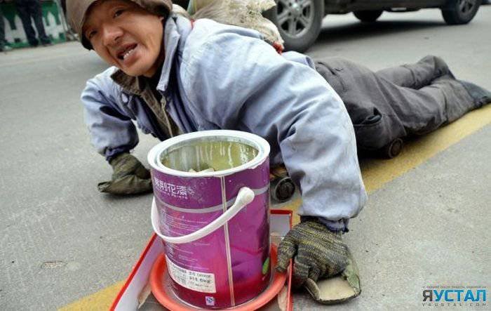 На улицах китайского города Венлинг, что находится в провинции Чжэцзян, этот мужчина просит милостыню, передвигаясь на небольшой тележке. В конце рабочего дня происходит чудесное исцеление, и бывший инвалид встает на ноги и терпеливо ждет автобус на остановке.