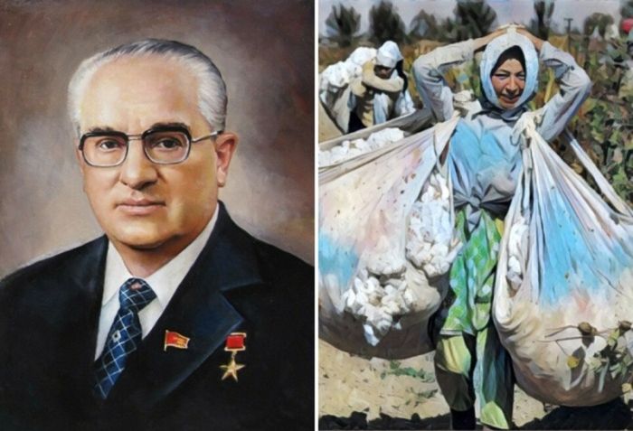 До конца пятидесятых годов в Узбекистане произрастали роскошные фрукты, а овощей было в избытке. Затем началась гонка за хлопком, ведь он был необходим и для изготовления хлопчатобумажных изделий, и для военного комплекса (порох составные части взрывчатых веществ). По этой причине хлопковая индустрия получала финансирование непосредственно из Центра СССР. Хлопок превратился в национальную идею-фикс. На полях трудились колхозники, горожане, даже школьники, которые работали до зимы, не посещая школы. Здоровью нации был нанесен вред, так как для обработки полей использовались вредные гербициды и пестициды.