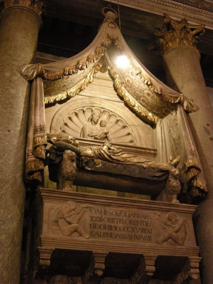 Но пират — это серьезно, это навсегда, и Бальтазар смог бежать. Прятался, был пойман. Заточен за решетку, но вышел за 38 тысяч флоринов золотом. Остался наглым до последнего: пришел к новому Папе и попросил снова сделать его епископом. И тот согласился, отдал ему родную Болонью. И зажил он опять долго и счастливо, и умер через четыре года от рака. А на его могиле поставили памятник, который сделал сам Донателло. Очень красиво, святое место теперь.