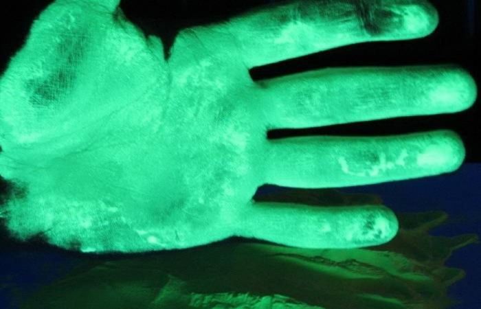 Ладонь светится в темноте от порошка, содержащего фосфор.