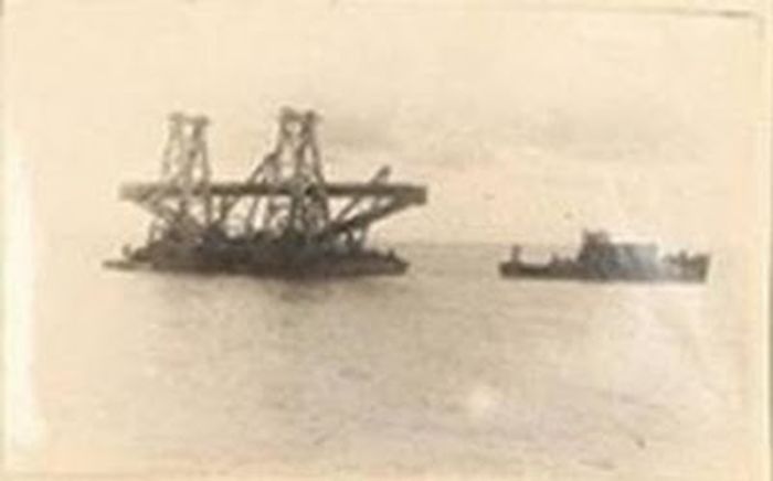 Транспортировка пролетных строений при строительстве моста через Керченский пролив, 1944 год.