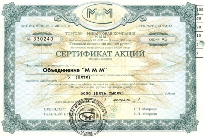 И вот, в 1994 году, начинается продажа акций АО "МММ". 1 акция АО "МММ" приравнивалась к 1000 российских рублей, их номиналы были достоинством 1, 5, 10, 20, 50 и 100 акций.