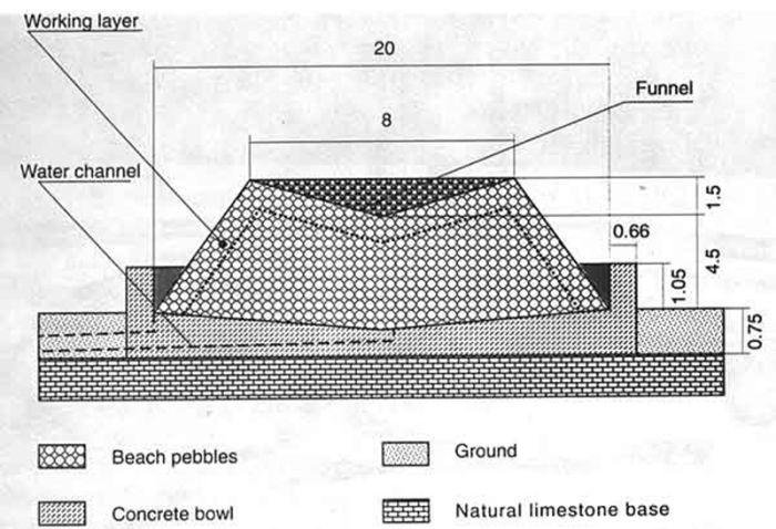 Она сложена из известняка, круглая в плане, диаметром 12 метров. Края чаши приподняты, дно воронковидное, от центра к борту проложен выводной желоб. Чаша была покрыта слоем бетона толщиной 15 см и заполнена крупной береговой галькой, уложенной в виде огромного усеченного конуса, — его высота составляла 6 метров, диаметр вершины равнялся 8 метрам, а общий объем гальки составлял немногим более 307 кубометров. Капельки росы, оседая на гальке, стекали на дно конденсатора и по желобу выводились наружу к трубе.