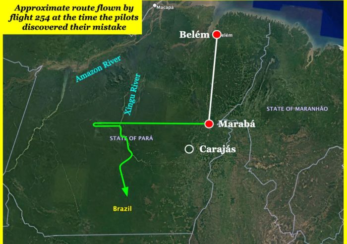 Когда, исходя из пройденного расстояния, лайнер должен был уже находиться неподалёку от Белена, командир решил, что они пролетели аэропорт назначения и развернул лайнер на обратный курс.