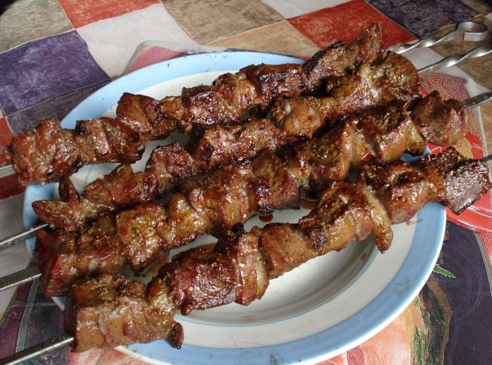 Существует огромное количество рецептов шашлыка, и практически все они сводятся к тому, что мясо, перед тем как нанизывать на шампуры и жарить, нужно промариновать. Можно выдержать мясо в вине, пиве, уксусе, кефире и даже минеральной воде. Конечно, шашлыки, приготовленные по разным рецептам, будут различаться тонкими оттенками вкуса, но всегда мясо, зажаренное на открытом огне после маринования, на вкус получается более нежное и сочное.