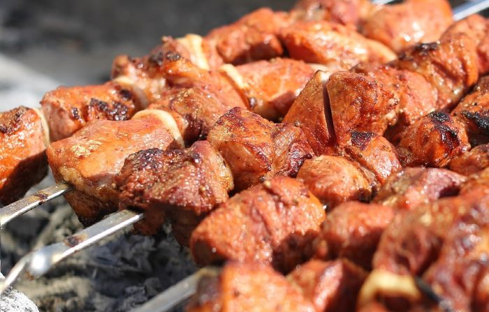 То, что мы просто называем мясом, с точки зрения биологии является скелетной поперечно-полосатой мышечной тканью с прилегающими к ней жировой, соединительной, а иногда и костной тканями. Если считать, что для шашлыка берут мясо без костей и с умеренным содержанием жиров, основным компонентом мяса можно считать белки.