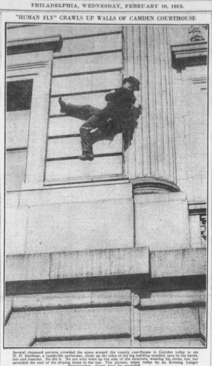 Самым известным «человеком-мухой» был Гарри Гардинер. Он, кажется, первым придумал эту практику, или, как минимум, первым придумал ее монетизировать. Он начал покорять небоскребы в 1905 и за свою карьеру (до 1926 года) залез на 700 зданий. Лазал он без страховки, так что, как понимаете, ни разу не упал.