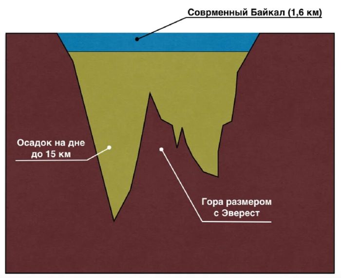 Это значит, что раньше Байкал мог достигать глубины свыше 16 километров (сейчас «всего» 1,6 км). Это гораздо глубже, чем самая глубокая точка в океане — Марианская впадина (11 км). При этом, просто вдумайтесь, грязью на дне Байкала затоплены горы размером с Эверест…