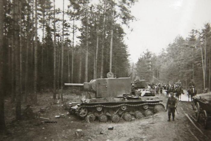 На фото вы видите советские КВ-2 из состава 18-й дивизии 7-го механизированного корпуса. Они были потеряны в начале июля 1941 года на дороге Сенно – Богушевск в Витебской области. Немцы детально засняли их со всех ракурсов, что в дальнейшем позволило историкам высказать некоторые предположения относительно судьбы этих машин.