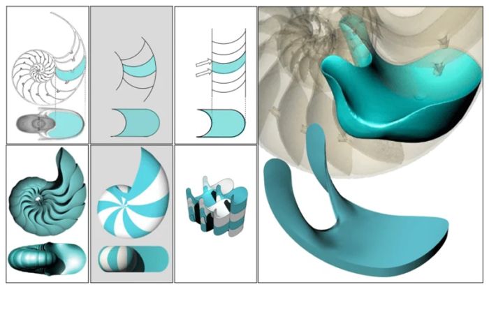 Изучая камеры наутилоидов, математики заметили острые углы в поперечных сечениях. Однако во внутренней трехмерной структуре они обнаружили более плавные геометрические фигуры, без определенных краев и с различными характеристиками укладки.