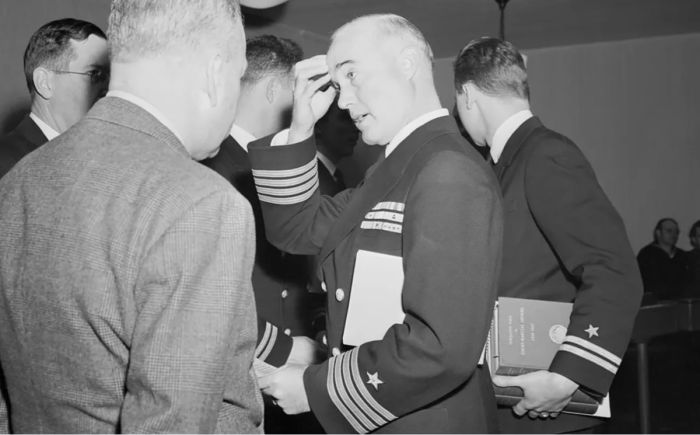 Капитан Чарльз Б. Маквей III (в центре, с рукой, касающейся лба) на суде в декабре 1945 года