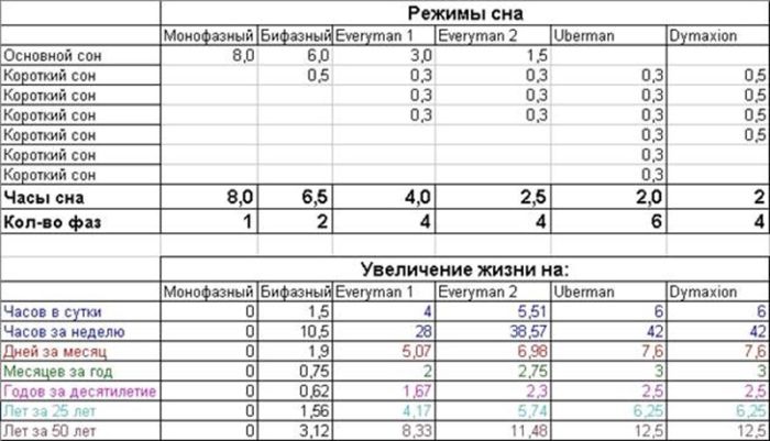 Обычно мы спим один раз в сутки – это можно назвать монофазным сном. Некоторые спят не только ночью, но и днём – это бифазный сон. Бифазный сон уже интереснее – можно спать ночью 5-6 часов и после обеда ещё 1 час. Уже получается 1-2 часа выигрыша по сравнению с монофазным сном. Так спала моя мама. Она держала коз и всегда вставала в 5 утра, чтобы их подоить. А ложилась спать не рано, обычно в 12 ночи. Но при этом она всегда спала 1 час после обеда, с 14 до 15 часов. То есть, долгие годы она спала по 6 часов в сутки.